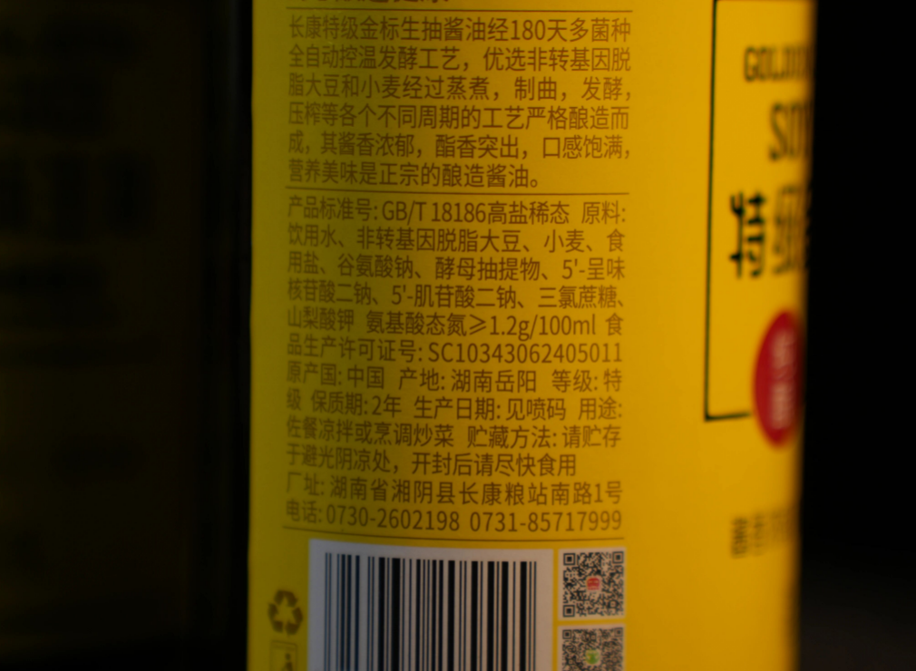 购买时先看配料表,优先选酿造酱油,它是以大豆、小麦等为原料,经微生物发酵制成,风味浓郁且营养价值高;配制酱油的营养和口感则差很多。长康牌特级金标生抽、纯酿红烧酱油,均精选非转基因大豆和优质小麦等原料,经180天多菌种全自动控温发酵工艺酿造而成,天然营养,口感上佳,家庭必备。